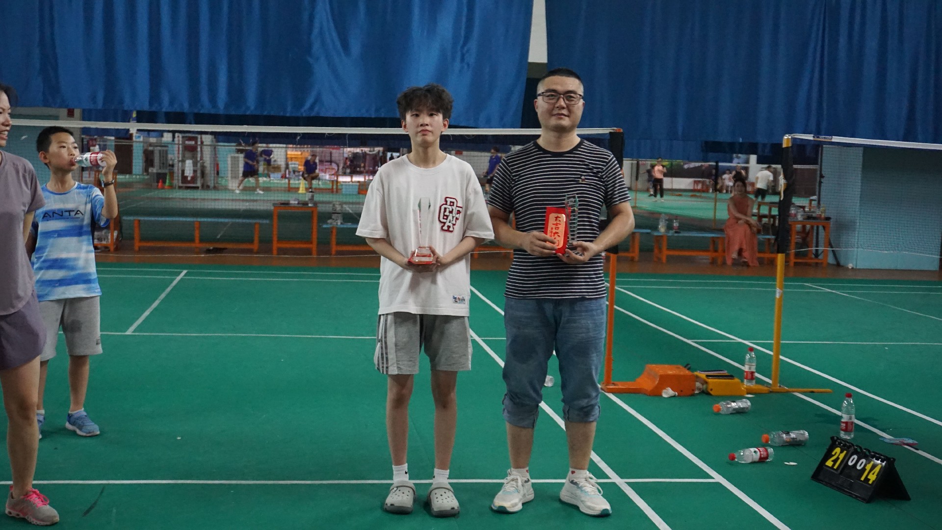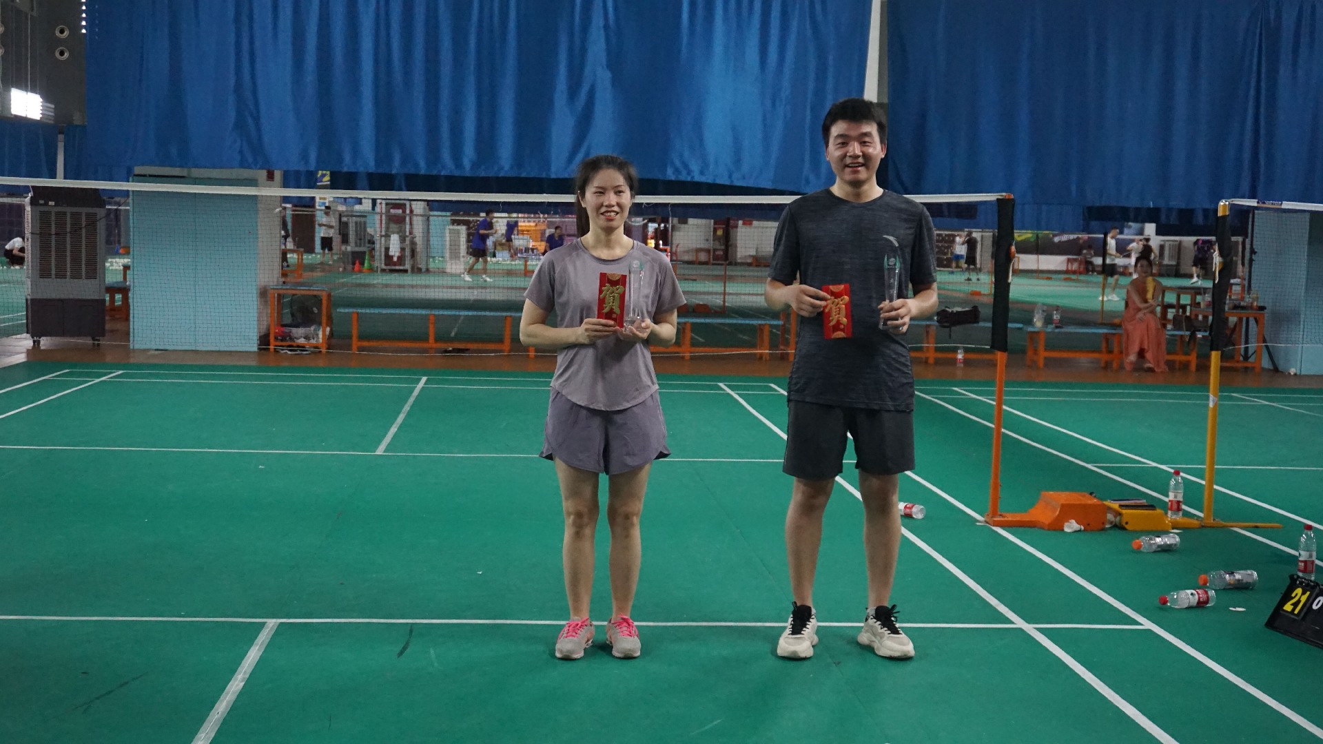 比赛结束后,董事长给男单、女单冠军颁发了奖杯和奖金,总经理给男单、女单亚军颁发了奖杯和奖金,销售部副总给男单、女单季军颁发了奖杯和奖金。